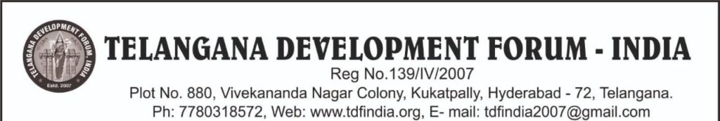 Telangana Development Forum (TDF-India ) is a NGO founded in 2007 to provide platform for the people of Telangana state for various development and cultural activities for the overall upliftment and development of Telangana with a Mission that everyone should have access to basic amenities like good Food, Health, Education, and Employment and Vision to take up initiatives in area of Agriculture, Education, Health, Arts & Culture, Skill Development, Women empowerment and serve the deprived communities in Telangana. • Donations to TDF-India projects are 80G Exempted, 12A Certified. Account Name-Telangana Development Forum-India, HDFC Bank, Account number: 50200048711852, Nacharam branch, Hyderabad. TDF Registered Address: TDF –India H.NO: 3-5-119/c, Plot no 880,Vivekanandnagarcolony,Kukatpally,Hyderabad, 500072 TDF New Office Address: H. no 1-10-1/21,Street no. 5, Ashok Nagar Hyderabad -500020. TDF India Registration No 139/IV/2007 Ngo DARPHAN Registration Number: TS/2021/0282202 CSR Registration number: CSR00072638 Website: www.tdfindia.org